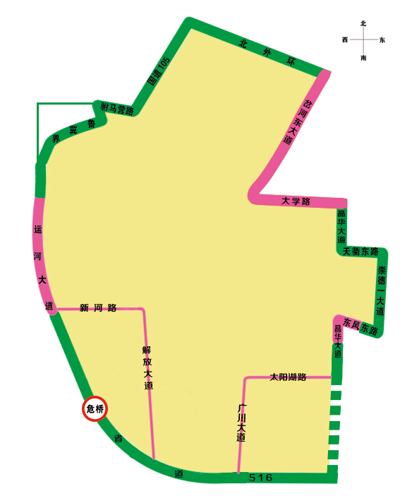 ? 駙馬營路—G105—北外環—岔河東大道—大學東路—晶華大道(北段)—天衢東路—崇德一大道—東風東路—晶華大道(南段)—S516—運河大道—魯冀界以內。